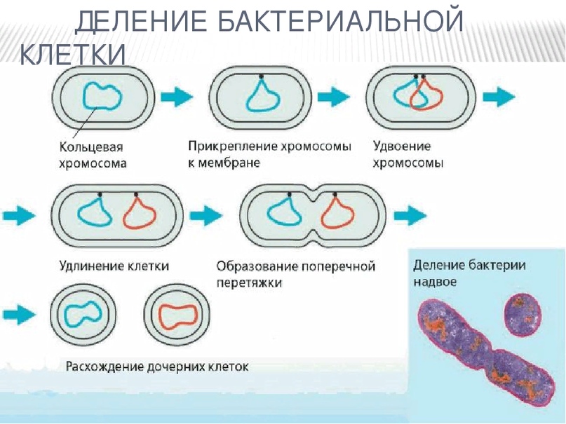 Встречается у прокариот. Заключается в том, что кольцевая хромосома удваивается, в районе экватора клетки образуется перетяжка. От материнской клетки отделяется дочерняя.