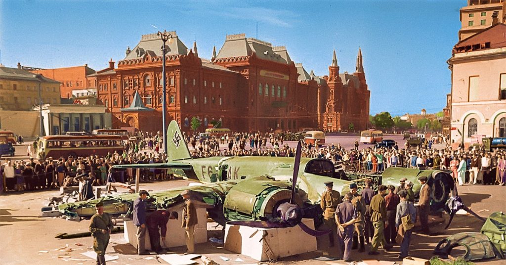 Немецкий Junkers Ju-88 на пл. Свердлова (наст. Театральная) в Москве. 25 июля 1941. Архивное фото.