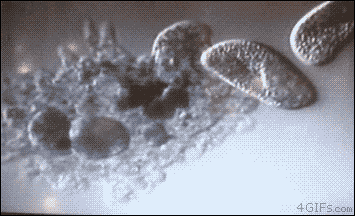 - Фагоцитоз. Амеба поедает инфузорий.
