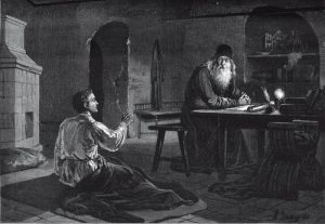 Ведают потомки православных земли родной минувшую судьбу, своих царей великих поминают за их труды, за славу, за добро — а за грехи, за темные деянья спасителя смиренно умоляют.Пимен. Ночь. Келья в чудовом монастыре.