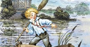 Игорь забрался в лодку и поднял флаг. В этот момент он почувствовал себя адмиралом. Раскачав лодку, он наблюдает за кругами, которые пошли по воде. Засмотревшись, он не заметил, что цепь, на которой держалась лодка, оборвалась. Когда он опомнился, до берега было уже несколько метров.