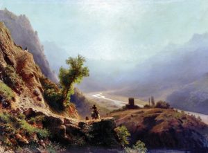 С первых строк перед читателем открывается панорама вида с горной вершины. Стоя «над снегами у края стремнины», поэт лицезреет «потоков рожденье и первое грозных обвалов движенье». Его внимание привлекает парящий в воздухе орел – символ свободы, о которой мечтает поэт. Простирающийся внизу пейзаж, автор описывает с высоты птичьего полета. Он видит водопады и реки, животных и птиц, одинокого всадника и жилища горцев. Атмосфера вольной жизни, великолепие природы и масштабность этой картины вызывают у Пушкина восторг и восхищение.