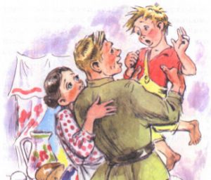 Пришел он домой только к вечеру и увидел, что мама не одна. За столом вместе с ней сидел солдат. Им оказался отец Никиты. Обнимая отца, он понимал, что теперь ему некого бояться. Наутро он громко сообщил всем своим недругам, что теперь отец будет всегда с ними и никогда от них не уйдет. Эту речь случайно услышал отец, находившийся в сарае. Вместе они привели в порядок двор, во время работы Никита попутно рассказывал отцу про свои фантазии.