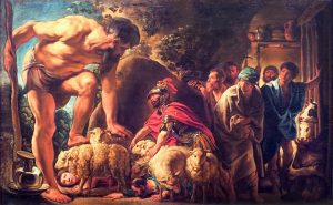 Феаки сопровождают Одиссея на Итаку и оставляют его спящим на острове. Во время обратного пути Посейдон превращает их корабль в камень. Афина подсказывает Одиссею, как победить женихов и превращает его в старца.