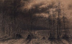 В первой части произведения Бунин описывает мрачный российский пейзаж. Перед нами открывается невероятно унылая, преисполненная тоски картина одного ничем не выдающегося зимнего дня на закате. Мы буквально ощущаем настроение этого дня, его цветовую палитру. Автор описывает бескрайние просторы Родины, с её лесами: это описание навевает страшное уныние. Мы ощущаем: «мертвенно-свинцовое небо», удалённость человеческого жилья, черноту соснового леса и полную депрессию.