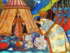 Вдруг откинулся полог шатра, и в нем появилась девица невиданной красоты, то была сама Шамаханская царица. Сраженный ее красотой царь, пошел за ней, забыв о погибших сыновьях. Вместе они пировали семь дней и семь ночей, позабыв обо всем на свете.