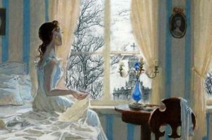 Раннее пробуждение героини, увидевшей в окно преображенную землю, как бы свидетельствует о конце кризиса, как в природе, так и в ее душе. Побелевший двор, куртина (клумба), кровля, забор – все покрыто зимним узором. На стекле мороз своей кистью нарисовал затейливые картины. Все говорит о том, что зима, как полноправная хозяйка, наконец-то, вошла в свои владения.