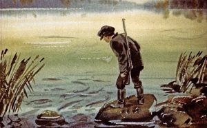 Так подошел к концу очередной день. Сооружая ночлег, мальчик ощутил под ногами небольшие холмики, указывающие на то, что недалеко находится водоем. Обрадовавшись, он начал продвигаться вперед в надежде, что выйдет к Енисею, но вместо реки увидел большое озеро, кишащее рыбой. Он не мог поверить своим глазам, потому что никогда не видел такого, чтобы рыбу можно было практически ловить руками. Здесь же плавало множество уток, двоих из которых Васютка приготовил на ужин. Ночью он ощутил острую тоску по своей семье и по школе. Сожалел о том, что иногда плохо вел себя и тайком курил папиросы. В эту минуту он готов был отказаться от всего, лишь бы снова очутиться дома.
