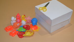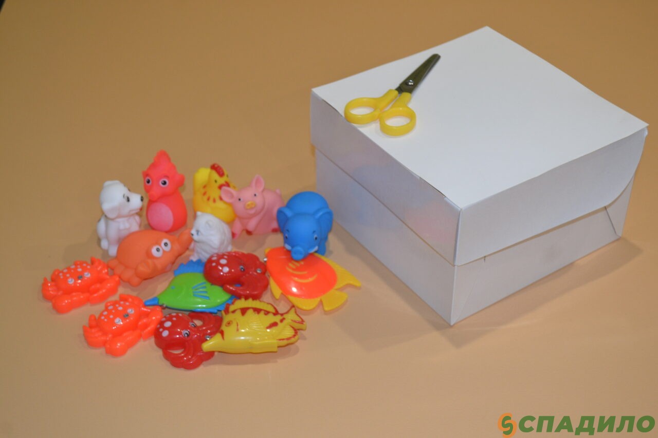 Материалы для упражнения: небольшая пустая коробка, ножницы, игрушки.