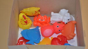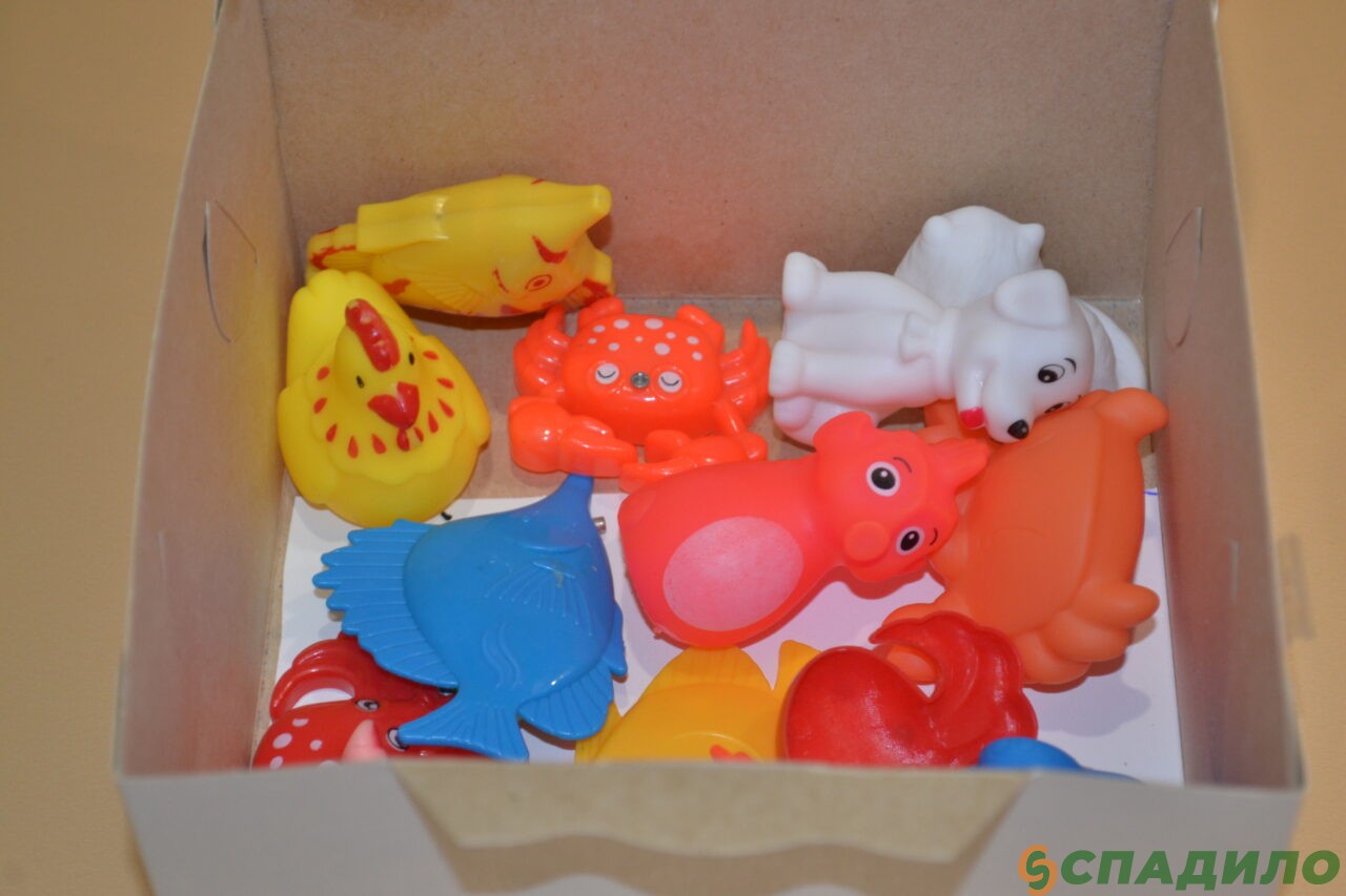2. Заполните коробку различными предметами, которые получится достать через вырезанное вами отверстие (игрушки, мячики, кубики, колечки и т. п.), а затем закройте.