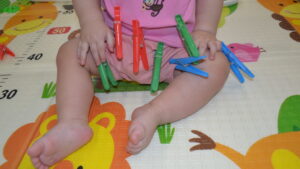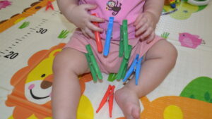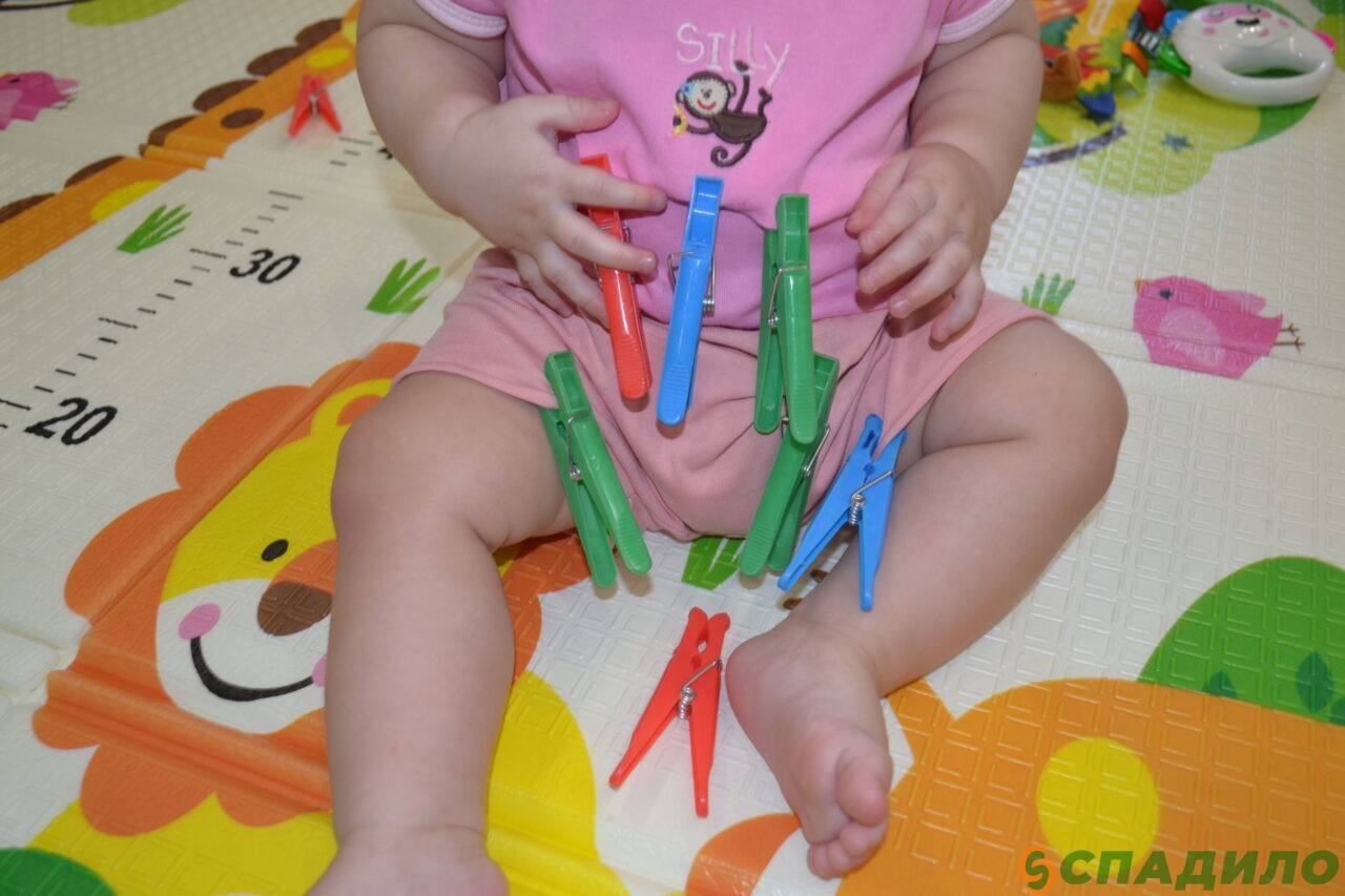 1. Возьмите 5-10 бельевых прищепок разных цветов и положите их перед ребёнком. Пусть он немного поиграет с ними.
