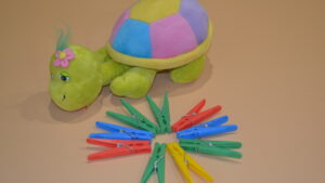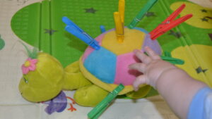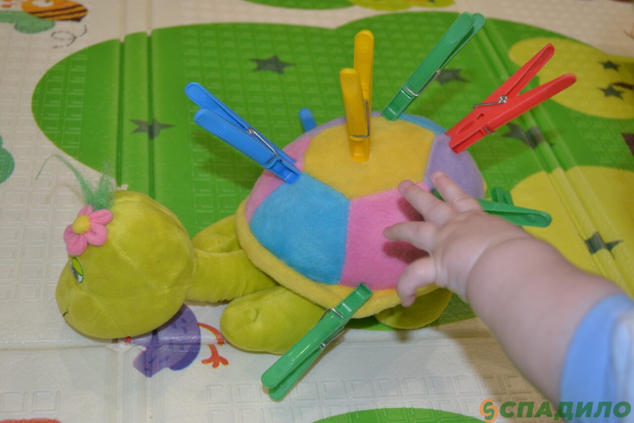 Также вы можете прикрепить прищепки на любимую мягкую игрушку. Спросите малыша: «Что случилось с черепашкой?» Ребёнок с удовольствием снимет всё лишнее со знакомой ему вещи.