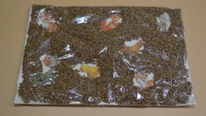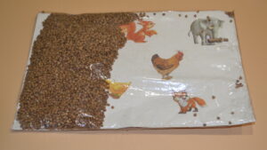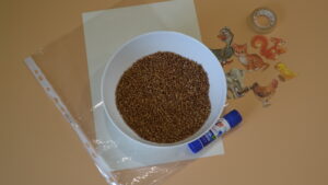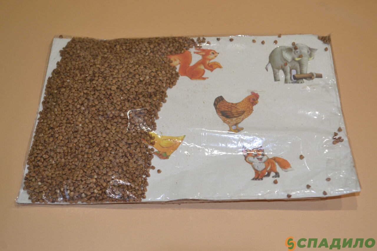 Равномерно распределите крупу на картоне. Изображения животных не должны быть видны. Не забудьте хорошо заклеить открытый край скотчем.