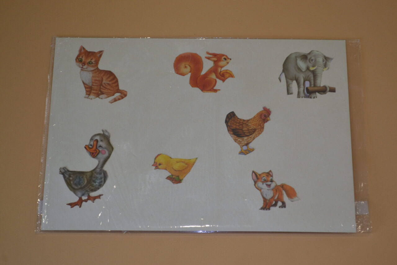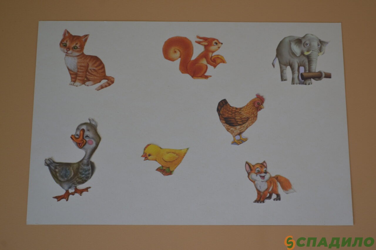 5. Теперь очередь малыша. Если он не приступает к делу, возьмите его руку и помогите. Продолжайте называть животных, говорите громко и отчётливо. Обязательно хвалите ребёнка, когда он находит зверушек.