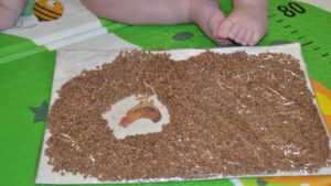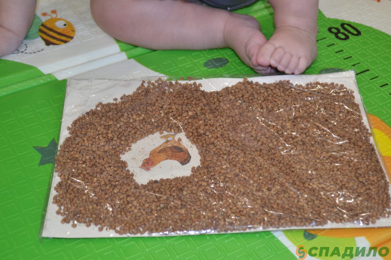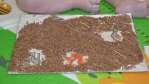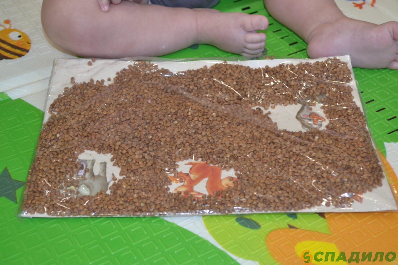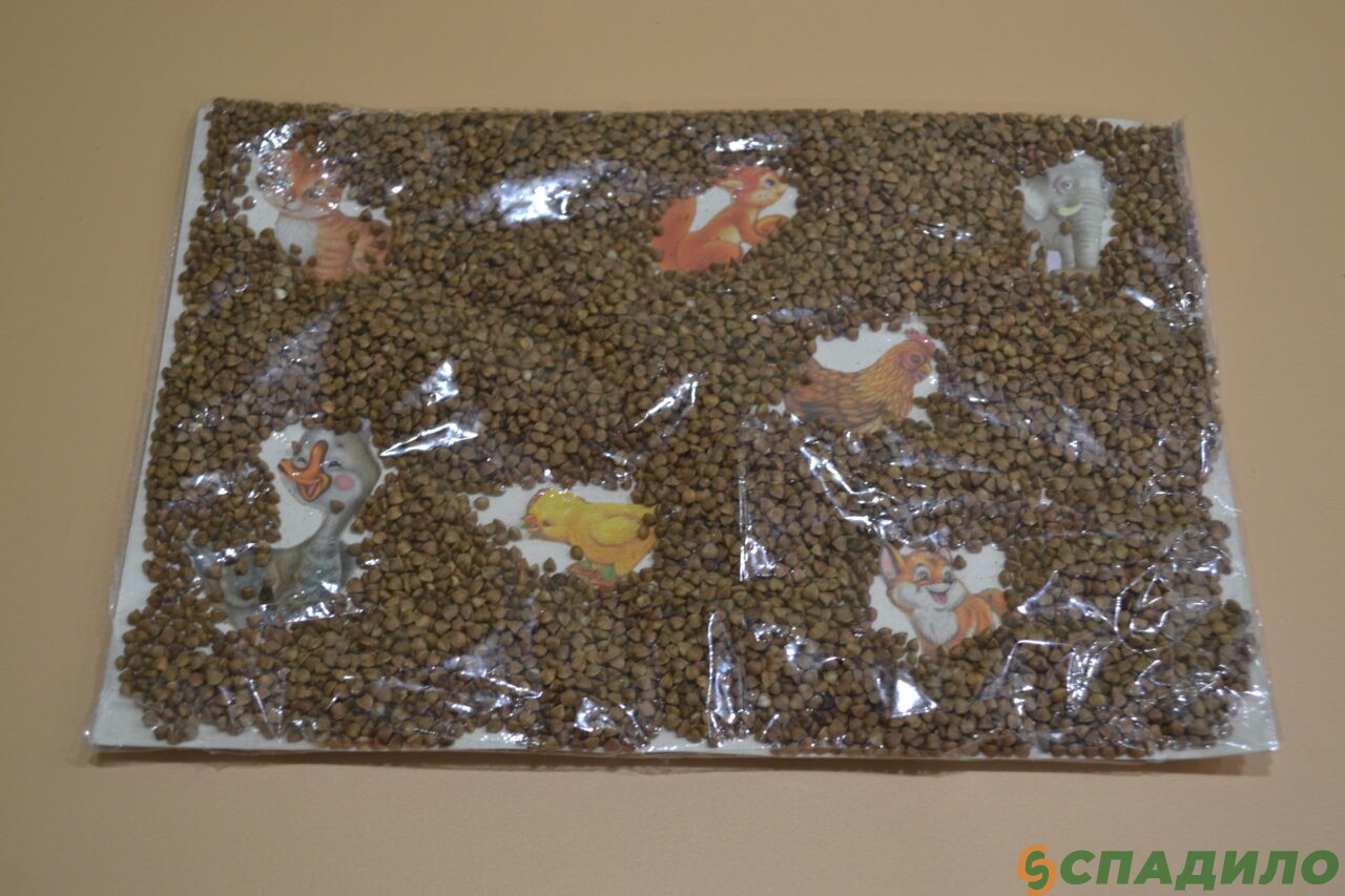 4. Расположите готовое пособие перед малышом. Задача ребёнка – найти животных под крупой. Чтобы кроха понял, как правильно действовать, отыщите несколько зверей сами. Скажите: «Кто здесь спрятался? Это курочка. Курочка говорит «ко-ко-ко».