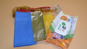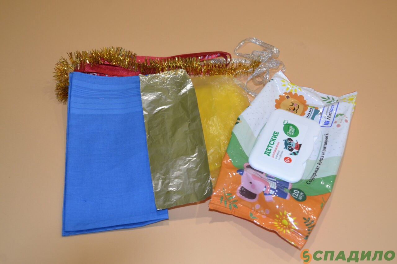 Материалы для упражнения: пустая упаковка от влажных салфеток, тканевые платочки, атласные ленты, фольга, полиэтиленовый пакет
