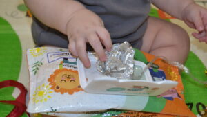 3. Положите наполненную упаковку перед малышом и скажите ему: «Давай посмотрим, что же там есть?». Начните сами тянуть за начало ленточки, если малыш сразу не поймёт, что ему делать.
