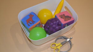 Материалы для упражнения: пластмассовые мячики, любимые игрушки малыша, двусторонний скотч, корзинка.