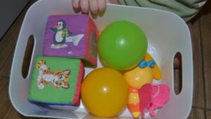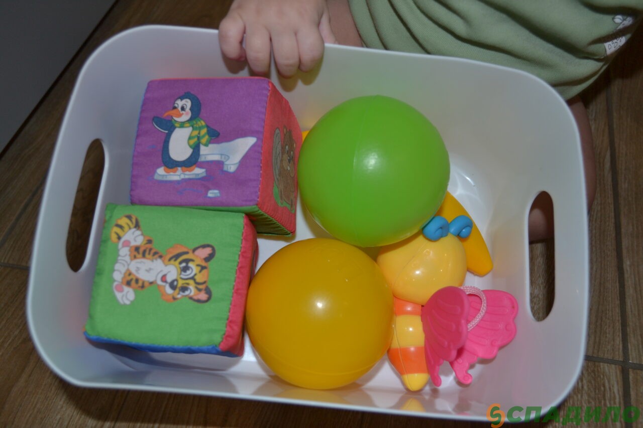 2. Подготовьте корзиночку, коробку или мешочек. Покажите малышу, как можно отрывать мячики или игрушки от поверхности и складывать их в ёмкость. Повторите несколько раз.