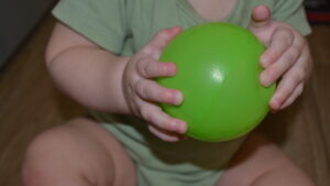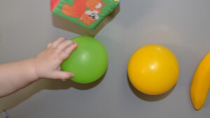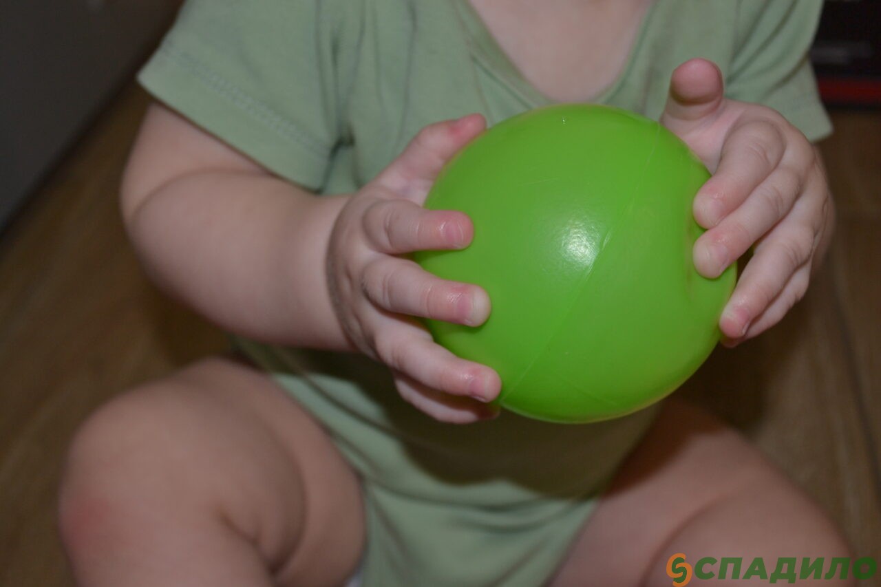 4. Когда все предметы будут собраны, покажите крохе, как можно играть с мячиком. Подбрасывайте мяч, ударяйте об пол, катайте. Дайте один мячик малышу. Ребёнок обязательно «подключится» к игре.