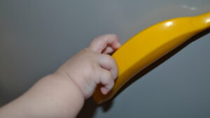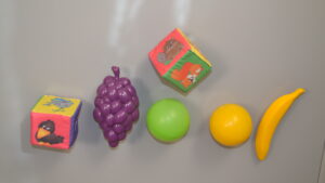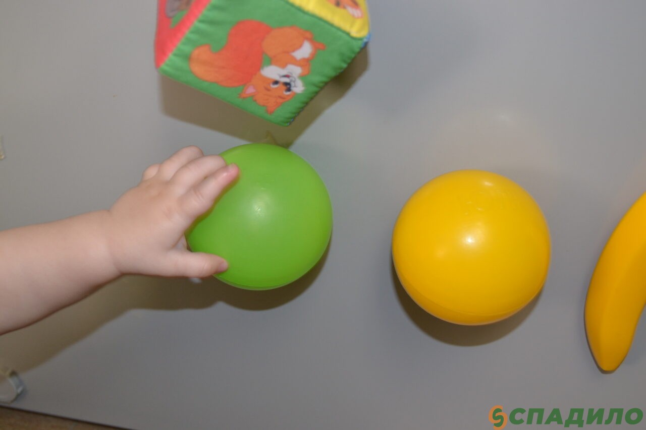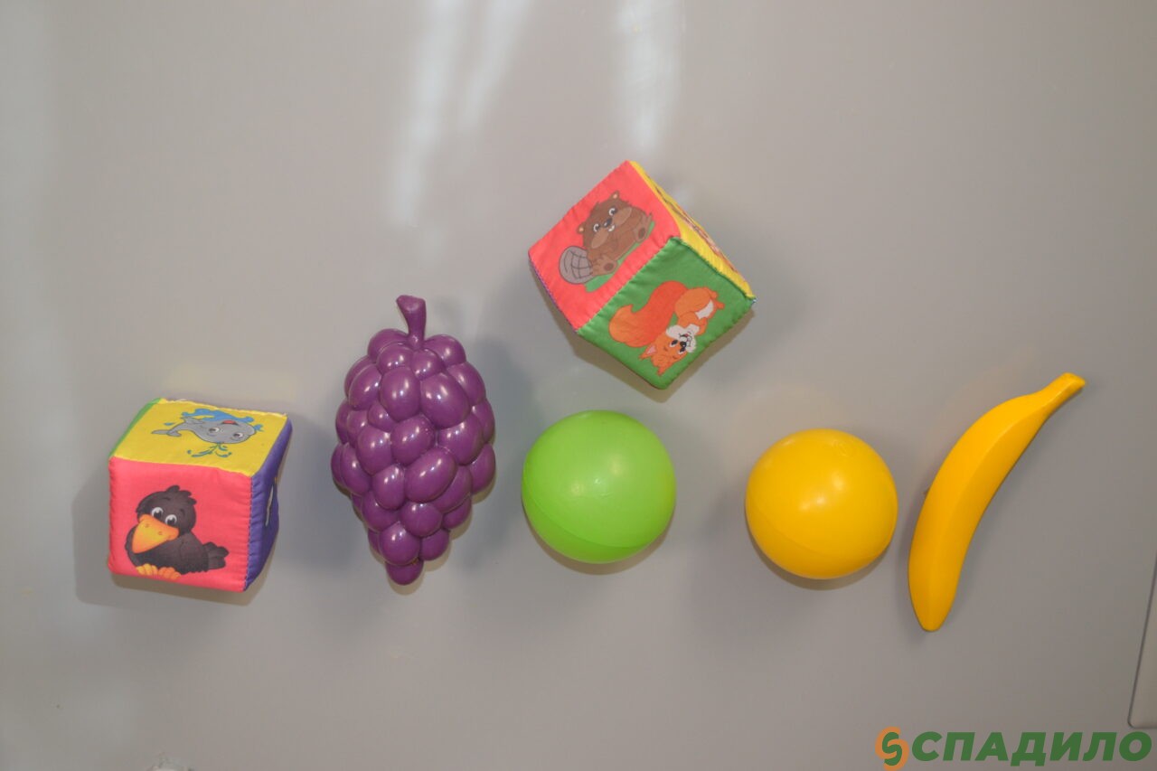 1. Приклейте пластмассовые мячики и фрукты, мягкие кубики, погремушки и др. на ровную поверхность с помощью двустороннего скотча. Это может быть стена, мебель или пол. Главное условие – малышу должно быть удобно отрывать предметы.