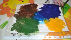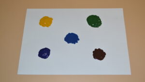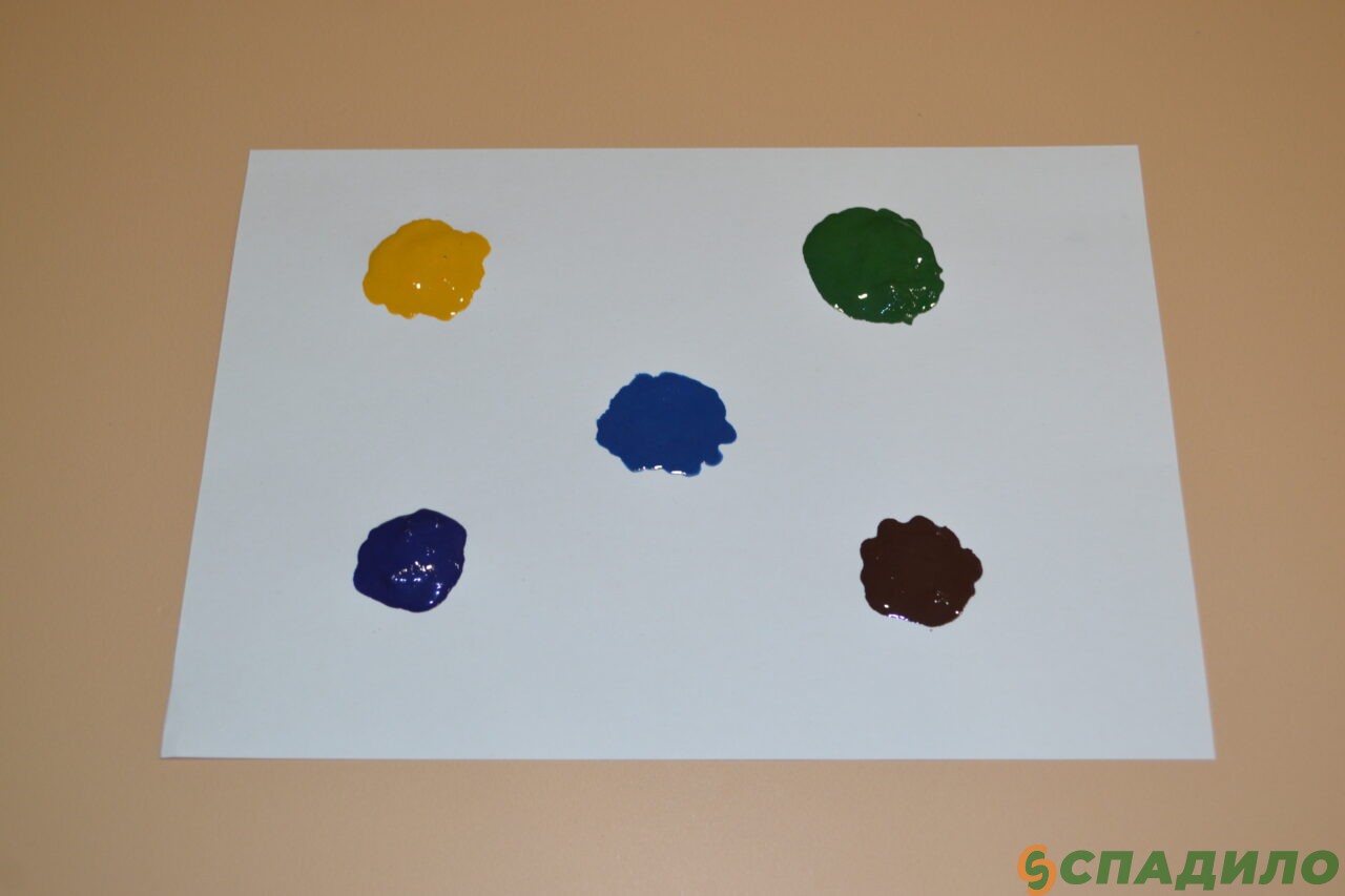 1. На лист белого картона с помощью кисти нанесите гуашь пяти цветов. Краски должно быть столько, чтобы её можно было размазать. Располагайте краску в разных местах листа.