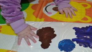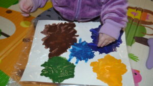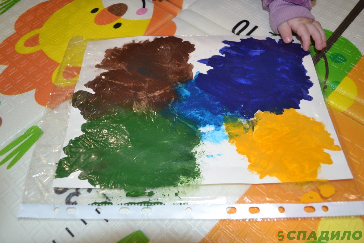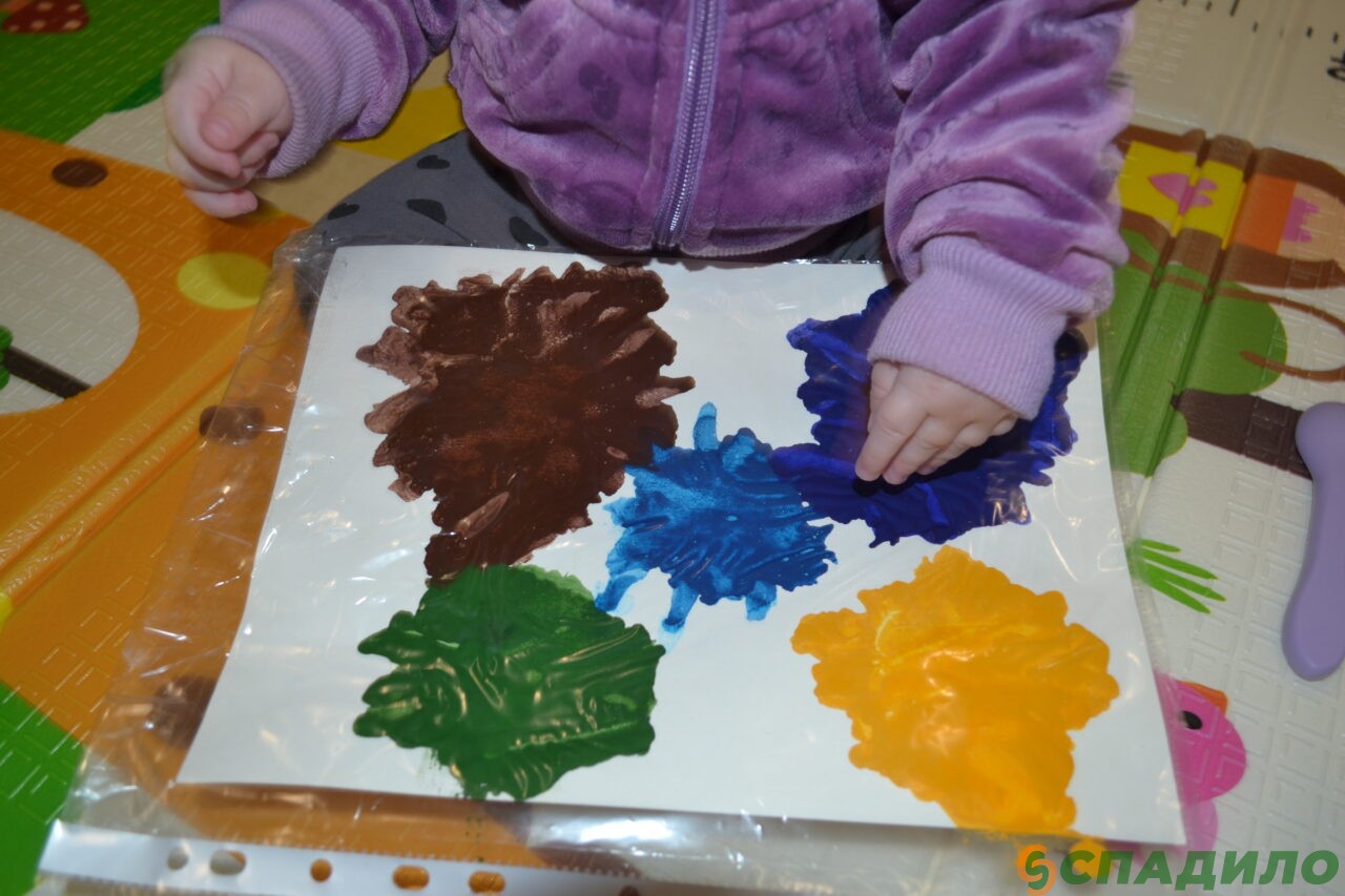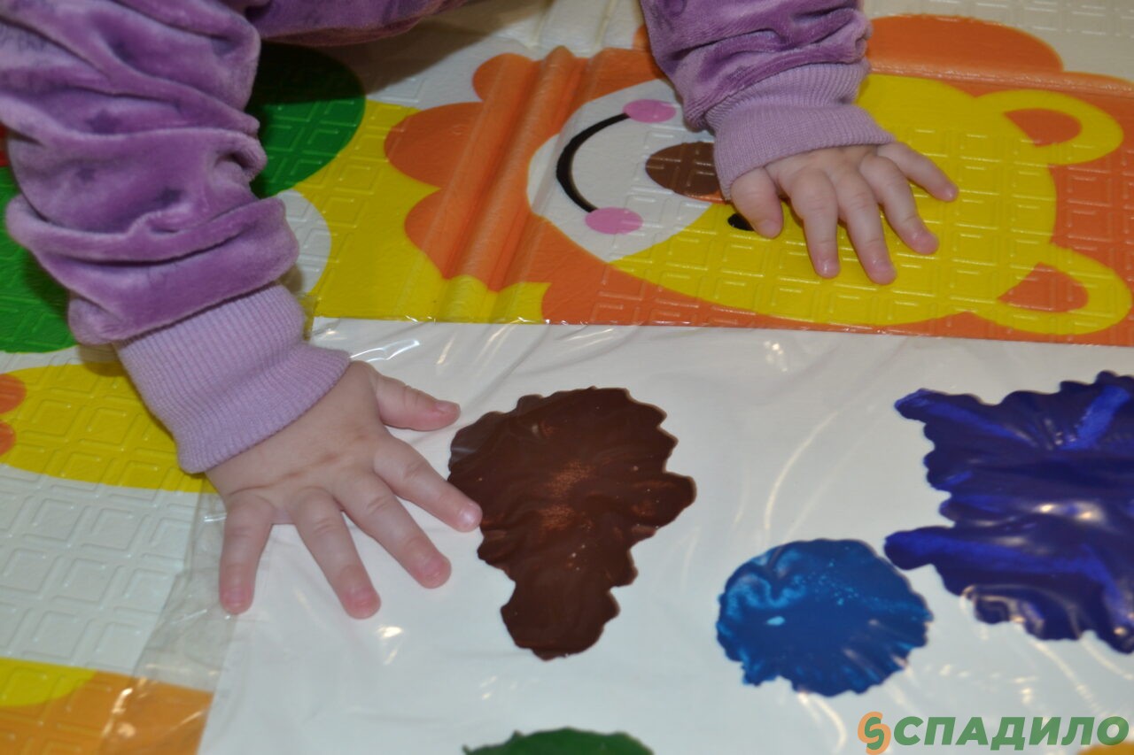 3. Посадите малыша в стульчик для кормления или на игровой коврик. Положите перед ним «холст» и ласково скажите: «Давай порисуем!» Возьмите пальчик ребёнка в свою руку и покажите, как можно размазывать краски. Попробуйте похлопать по краске ладошкой.