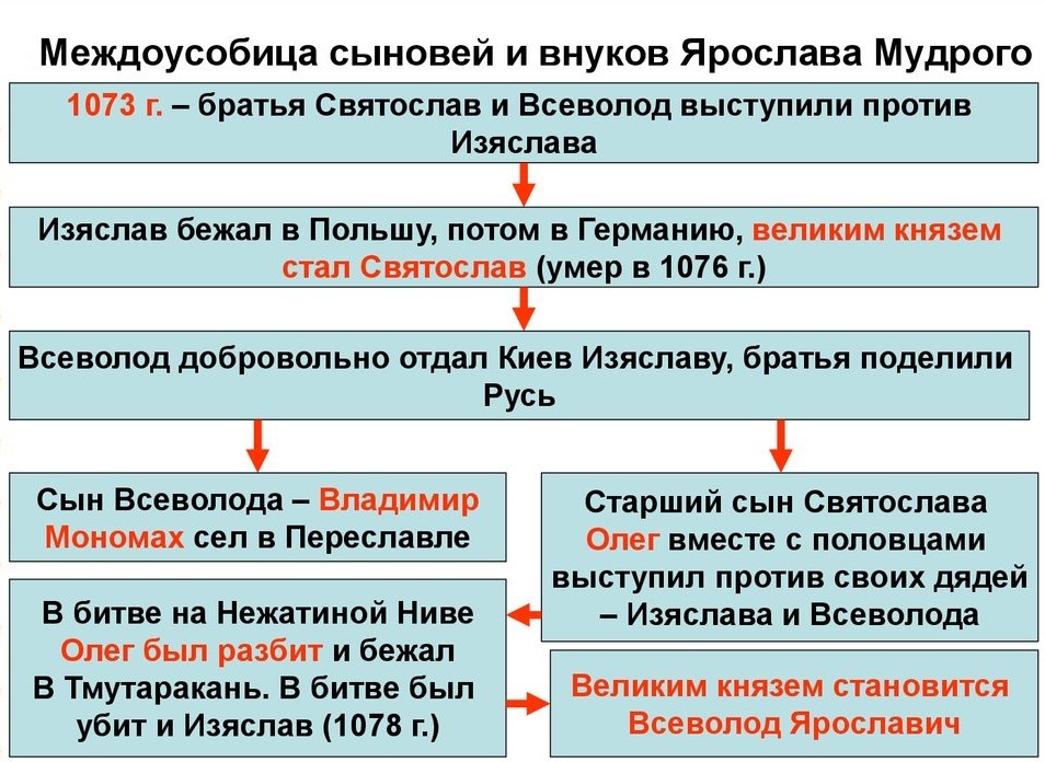 Борьба завязалась между двумя братьями – Изяславом и Всеволодом ( по совместительству и между их сыновьями). В борьбу за власть быстро вступил сын Святослава Олег. В 1078 году он отправился в Тмутаракань к своему брату, поклявшись, что вернет отцовский престол.
