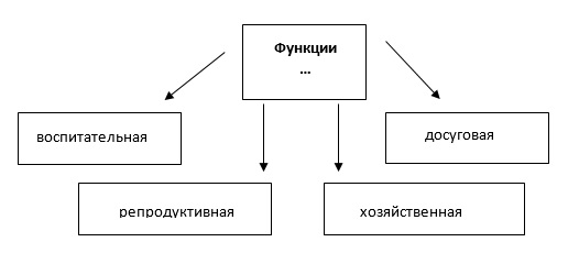Задание, где дается не таблица, а схема, на первый взгляд кажется сложнее – ведь здесь нет характеристик каждого элемента, которые могли бы облегчить понимание того, о чем идет речь. Однако, если внимательно посмотреть на функции, нетрудно вспомнить, что такое их сочетание характерно для такого социального института, как семья.